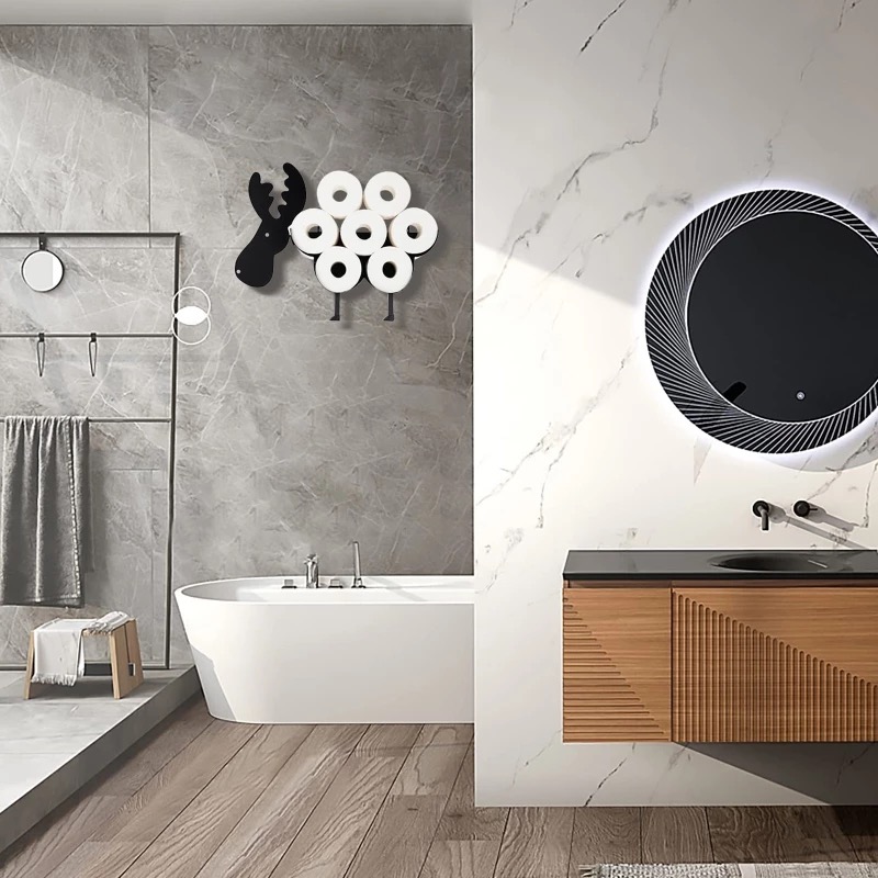 Stojak w kształcie łosia, jest solidnie wykonany w modnym i stylowym kolorze czarnym. Z pewnością wprawi w dobry humor wszystkich odwiedzających toaletę.